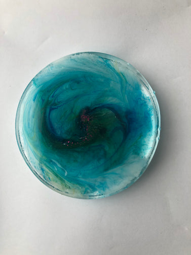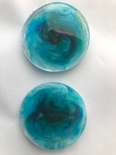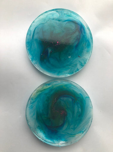 This is a set of beautiful Petri dish/Nebula style coasters. Made of Resin and inks/dye. They are quite thick. Almost a light paperweight.